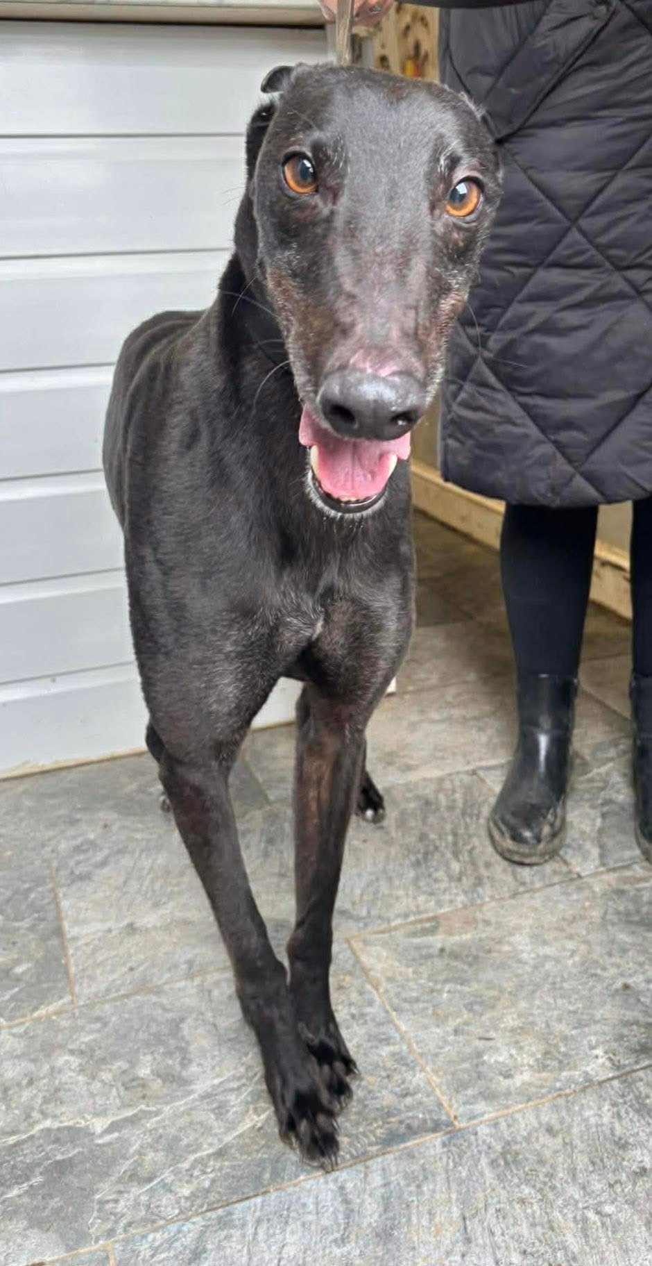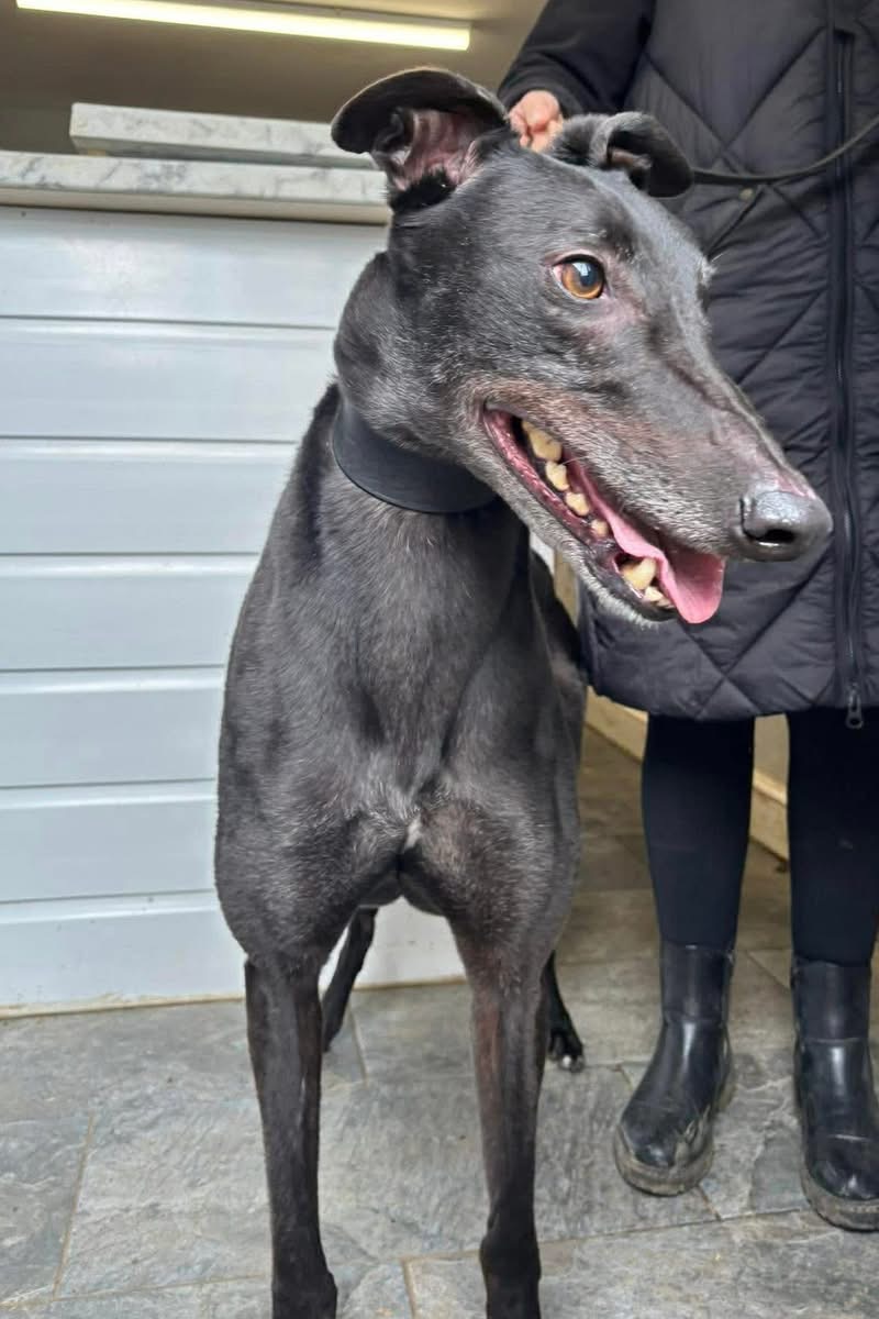 Lenny is doing so well with us. When he first came in, he was surprised by other breeds and reacted to them. He had never seen them before. But he is coming on leaps and bounds and as typical of the Greyhound, they are so lovely and friendly and we are sure this improvement will continue with a new owner